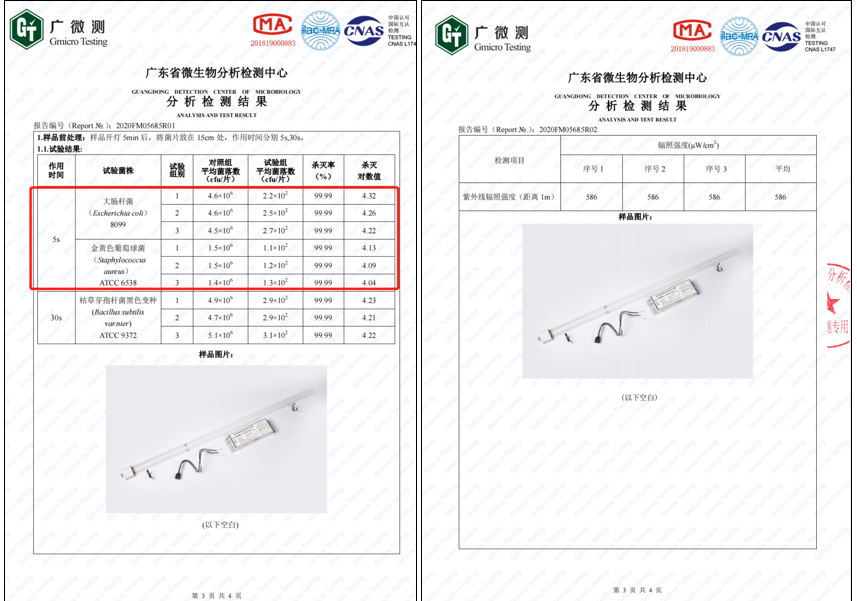 紫外光源第三方检测报告:(辐照强度+杀菌率)